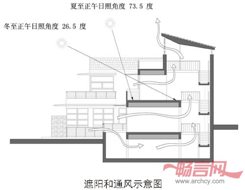 采用传统建筑技术,建造真正的绿色环保建筑:采用先进外墙保温;以合理的开窗和遮阳手段组织光线视线和阳光的利用(Passive Solar Energy);以烟道效应(Stack Effect)和对流通风(Through Ventilation)手段组织室内空气交换;以“四水归堂”的屋面排水方式会受雨水;结合地形高差安排地下室,充分利用空间提升土地价值;设计出重力排污的地下室卫生间。