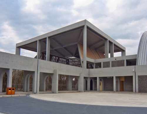 我们希望用最直接最快速的方式建造,因此大量采用了结构性清水混凝土,钢拱屋面和本地灰砖、竹材。另外,为了快速建造所有的场馆,我们把场馆屋面变成拱形,跨度为44.5m*18.6m。清水混凝土连廊上覆盖着轻质金属网壳的屋顶,便于各个场馆的通风采光并有利于地震逃生。各组场馆建筑拱形钢网壳屋盖结构体系组合成有韵律的空间体。对应于轻钢的屋架体系,两侧的混凝土连廊以相同开间的柱列形成有节奏感的行进空间,柱廊院落相间排列,当人们在柱廊中行进,产生了变化丰富的光影节奏。在施工图设计中,模数化的设计方式使得施工图纸更易于达到精细化的设计程度,减少误差。