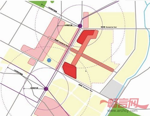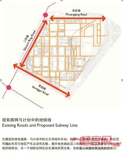 成渝高速路、二环路和双庆路的交叉口形成了一个高能见度与便利的商业节点。双庆路往北的现有商业服务,以及未来的地铁站也将创造出一个比较人性尺度的环境。在基地的西边与北边,沿二环路和双庆路的商店走廊将会创造出一个有活力的对外面貌。
