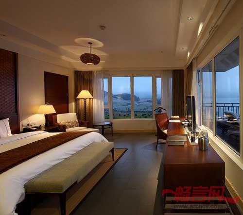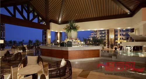 简洁的建筑体在海水、沙滩的环绕下,更加突出主题想要营造的休闲度假氛围。酒店大堂采用通透明亮的空间结构,仿佛海天与空间的构造浑然一体,让人感觉不到室内与室外的界限。大堂设计运用点线面的对话。线的斜屋顶,面的天花板,简单过渡,连之一体。地面设计,整体空间与点的对立。地面木材,不同色调木材拼出,平面空间演绎层次。大堂内部巨幅沙雕背景,以群鱼追逐影子排列成中国龙形象,古朴遒劲。水面浮道,连接大堂吧和室外;水面与海面相连,天色与水影相接,海天一色,静谧自由室内户外。