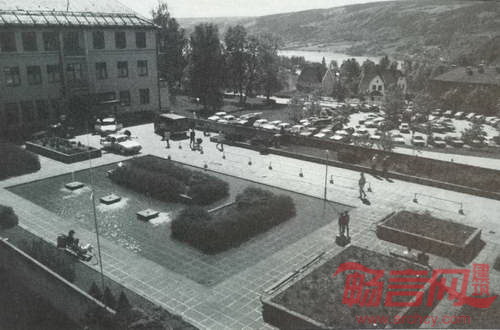 (图1利勒哈默尔县医院主入口处:方形水池、种植池和两个圆形停车场)