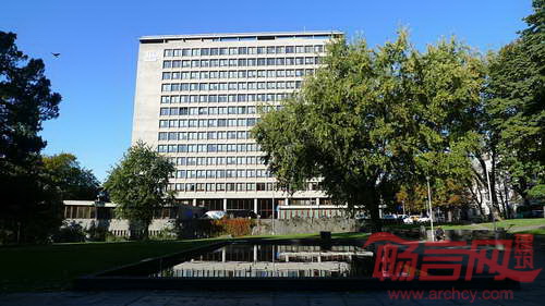 挪威水电公司公园是挪威水电公司(NorskHydro)办公大楼前的花园,14层高的一字形办公大楼主楼、与Drammensveien路和BygdøAllé大街,共同限定出三角形的公园用地。在近年的有关挪威现代主义园林研究中,水电公司公园被誉为二战后挪威现代主义园林的一个重要标志。它的“设计非常清晰地传递出源自建筑和抽象艺术的启迪,……景观更多地像艺术和建筑作品,而较少像风景”[9]。水电公司公园被认为打破了当时挪威“公园设计灵感来源于自然的传统,促成了园林朝着都市主义景观的发展趋向”[9]。