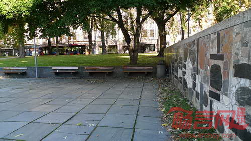 公园为四周高中间低的下沉碗状式低地,从办公楼通往Drammensveien的直路(路对面是挪威国家图书馆)把公园分成2部分。直路和Bygdø Allé大街以草坡过渡,草坡低端部是一段保留的宽挡土墙,墙上固定了一系列的坐凳,沿挡土墙长向布置的6个灯柱,不仅强化了挡土墙竖向上的空间界面,也把空间延伸到办公楼前与直路相垂直的高挡土墙。通往Bygdø Allé大街的2条小径垂直于宽挡土墙均匀地布置,打断了挡土墙的连续。小径、宽挡土墙、直路、片墙、方形水池和石板铺装的方形地面,形成富有构成艺术的线面组合,勾勒出公园中人群活动的主要区域。公园其余部分以疏林草坡延至水电公司大楼前的高挡土墙和城市街道边(图8)。公园中最引人注目的是从BygdøAllé大街与Drammensveien路交汇区域进入公园主入口区的两面与人同高的密斯式片墙,前后错落地平行而置,与挡土墙形成L行的围合,守护着方形水池映照的美景。两面片墙由艺术家OddTandberg设计,墙面用锯开的石板拼贴而成,有如构成的画(图9)。设计师的片墙组合,演绎出花园的流动空间,它和如画的片墙共同展现着现代花园的空间与艺术品质。