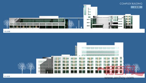 考虑各种原因,就建筑造型而言,设计思路是要现代,要适度。现代是功能和校园原有形象的提升和延续,适度则又是对历史文化的尊重和凸现。所以本方案在与附近古建筑群相呼应的路口一侧将报告厅的外墙处理成灰色的色调,并在立面上多以水平线型为主,以从视觉上降低和减缓对古建筑群的体量压力。同时因为层次性高度的限制,整个建筑划整为零、前后错落、高低有序、收放自如,灰空间穿插,又形成了十分丰富和别具个性及特点的校园建筑群。