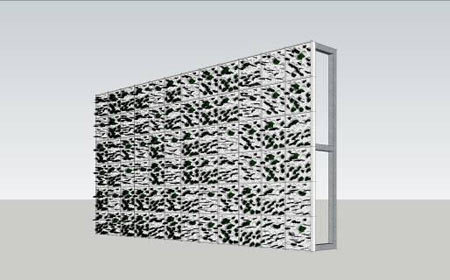 目前有一种新型绿色节能墙板,称为标准化的垂直绿化种植系统。它适合于建筑物的内、外墙,植物可以和墙面成90度角,可在各种环境下种植。该系统采用0.3m×0.3m的板块,板块材料是防紫外线,不可燃的聚乙烯制成。每个板块内包括一个营养基,板块约82-90mm厚,安装在不锈钢或铝框架上,框架被固定在垂直的墙面上。见图七