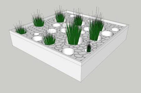 板块由结构的孔中生长的多种植物搭配组成,可以是叶状草本植物,也可以是藤本攀援植物,并采用增压喷头的水滴灌系统进行浇水、液体施肥,维护成本低,还方便植株替换。植物能从板块中长出200mm左右形成厚厚的绿毯,或是攀援直上的绿色幕墙。见图八