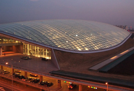 万平方米,地下两层,地上5层,建筑高度45米,结构类型为钢筋混凝土及钢结构设计,标段总价为48亿元人民币。 位于北京市郊顺义县天竺镇首都国际机场内,工程建筑面积33.5万平方米,占地面积约10万平方米,NO.物平面呈"工"字型,南北长747米,南北指廊东西宽343米,中央大厅东西宽121米,单层面积达9万平方米。