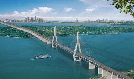 武汉第六座长江大桥。正桥全长4657米。公路桥为双向6车道,设计时速80公里/小时,主跨504米,主塔高189米,是世界上跨度最大的公铁两用斜拉桥,其中铁路桥可并排跑四列火车(两条客运线和两条货运线)。该桥因其独特的设计和特有的施工难度,被桥梁界誉为跨江桥的里程碑。 总投资30多亿元。