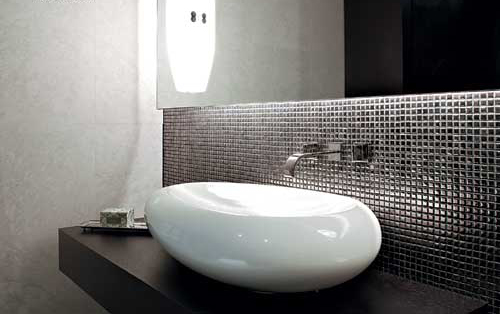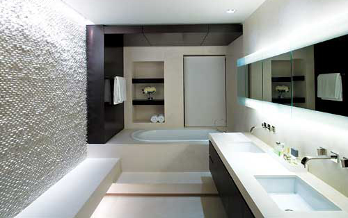 对于那些有幸参观主人卫生间的人来说,这里又是一处能够刺激感官的惊喜所在。平面上石灰石的使用——地坪、座椅、台阶,与完全饰面着嵌入式白色鹅卵石的竖直墙壁相互交叉。转角处设有浴缸,上空的Wengé木顶棚则创造出独特的对比关系和私密之感。