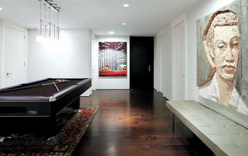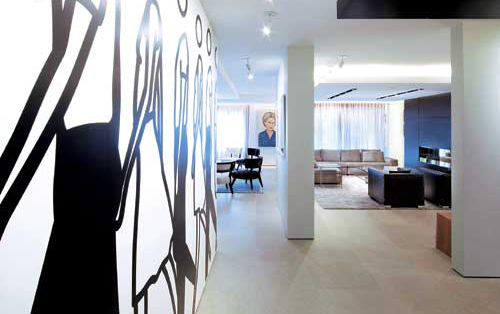 “为了让他们的生活被艺术品围绕,就必须在他们家中的任何地方都设计有艺术品,”吉苏.哈里里说,“照明设计至关重要,墙面空间也都有着专门的用途。”整间住宅的艺术之旅始于入口大厅中那令人眼前一亮的艺术品——占绝对主要地位的朱利安.奥培(Julian Opie)步行人体黑白壁画作品。