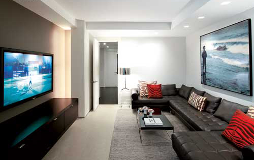 主卧室是以家具的布置使人们产生视觉焦点的众多空间之一。这里,低矮的内嵌式长椅将睡眠区与学习区分隔开来。客厅中,回收木材制作的鸡尾酒桌是典型的约·胡什曼德(John Houshmand)风格。仔细看桌面就会注意到,透明的玻璃盒子与附近墙面设置的矩形镜面壁龛组合在一起,看起来就像壁炉一般。另一处哈里里设计的经典之处在于:为艺术品创造令人印象深刻的建筑框架。在通往家庭活动室的走道中能看到一台袖珍三角钢琴和奥培的另一件杰出作品——精致生动的液晶屏幕,画面是身着比基尼泳装、边吸烟边眨眼的滑稽女子。