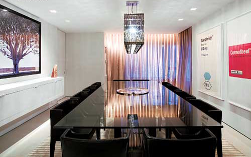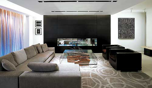 入口部分决定了5000平方英尺合并公寓所使用的材料和整体色调构成:米色的石灰岩地坪,淡黄色与土褐色的墙壁,以及黑色的Wengé木嵌板。Wengé木嵌板从墙面升起直至天花,巧妙地以各种方式不断提示着人们去注意每个独特的艺术作品或是设计元素。“这种连续性创造着某种宁静之感,不过在每个房间中的表现手法却并非完全相同”,吉苏.哈里里解释道。