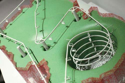 从空中俯瞰瑞士馆,其轮廓是一个想象中的未来世界的轮廓。它是一个开放的空间,最外部的幕帷主要由大豆纤维制成,既能发电,又能天然降解。展馆设计强调了对比,设计人员运用中国的阴阳原理,将缆车作为游戏的元素纳入到设计之中,带着乘客从负荷沉重的城市升入馆顶的令人赏心悦目的自然世界。