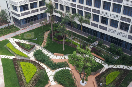 2、下凹式绿地指地势低洼的绿地。利用周围径流入渗凹处绿地,减少排水,涵养水分。设计下凹式绿地应尽量调整合理的绿地、路面、雨水口三者之间的高程关系,是绿地高程低于路面高程,绿地内设有雨水口,而雨水口低于路面高程而高于绿地高程。下凹式绿地增大了雨水在土壤中的入渗量、减少城市洪涝、节约了绿地的灌溉用水,同时减少了河湖的水质污染及淤积量,提高了绿地的土壤肥力。