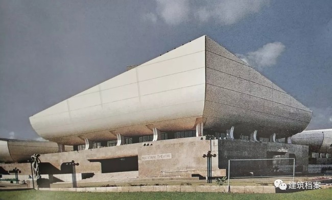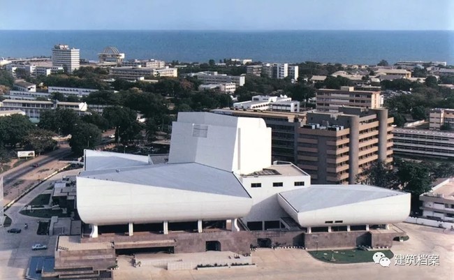 意向模糊之非洲艺术乃建筑灵感之源泉,马赛克壁画之神秘抽象,本土舞蹈之节奏鲜明,原生雕塑之极具力度,原始、炽热、感染、震撼。强烈启示下,一番思索,成方之体块三,施以旋转、弯曲、切割,建筑终成,奔放不失精致,豪迈不失浪漫,空间内外一体,已成阿克拉城之地标,深得加纳国民之心。其人将之绘于当地纸币“塞地”之上,以为纪念。