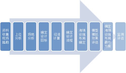 第二,雨水设计流程的确定。设计师始终需要关注雨水从哪里来,要往哪里去,如何对其进行渗、滞、蓄、净、用、排,雨水能够真正得到有效控制,最终达到设计目标。