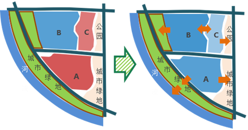可以看到图中A、B、C三个地块,A地块解决不了,可与周边的城市绿地和公园绿地进行联动,B地块解决不了可以与C地块联动,最后汇入城市绿地系统。最后,这个三角型区域能够完成上位提出的年径流总量的控制,径流控制的设计任务就完成了。
