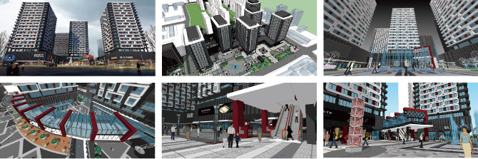 例如在石家庄新合作广场商业综合体中,综合项目规划的整体布局,设计师设计了五个不同性质、不同风格的休闲广场。整体建筑设计采用中国结的设计理念,由中国结环环相扣抽象变形而来的建筑立面,富有节奏感和韵律感,在重复与复制中体现稳重、内敛的气质。无过分的装饰,立面造型与平面功能紧密结合,平面功能在立面上都有直观的反应。通过提取建筑中的元素,设计师抽象出与建筑统一的符号语言,对标识、小品等景观原素进行了统一处理,提升了设计的整体体量,也实现了建筑、景观、室内一体化的精细设计。