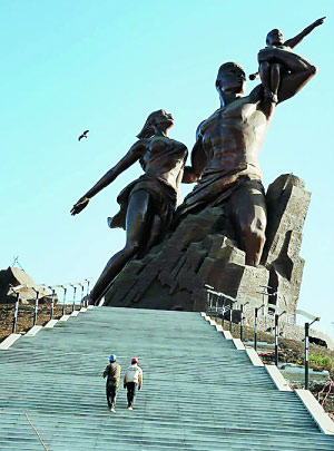 报道称,这个生动地刻画了怀抱孩子的夫妇形象的雕塑位于塞内加尔首都达喀尔国际机场附近,它已于2月8日完成组装,目前工程正在进行收尾阶段。据称,雕塑展现了推翻黑暗的奴隶贸易与殖民统治,争取自由与独立的非洲人面貌。整个雕塑高达50米,比著名的美国自由女神像还要高4米,预计建成后将成为西非的代表性象征。
