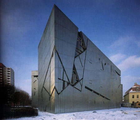 柏林犹太博物馆是原有柏林博物馆的犹太部分的扩建,是由以思考型建筑师和"纸上建筑"而闻名的解构主义的代表人物之一是布斯金设计的。原建筑是巴洛克式的风格。该地区的人文岁月相当复杂,直至1988年柏林墙仍然穿越此地区,因此这块基地代表了不同族群、不同意识形态,甚至不同历史结局的多样性图腾。里布斯金的方案以一种"他者"的身份,冷静地进入这一复杂的具有历史性经历过文明进程的地段。建筑在时间和空间上对于种种限制的"解构", 实际上是对现存人文环境的一种颠覆。扭曲的、痛苦而蜷伏的形体同老馆稳重、理性和沉闷的形态形成了强烈的对比。这种形体组合给人的视觉冲击是强烈的,它提醒人们:"历史在这一点上永远是凝固的。"对于传统建筑风格的切割,暗含着血淋淋的历史断面。这种试图唤醒人们心中的记忆,唤醒那段德国人对于犹太人血腥杀戮的历史。
