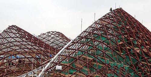 北京馆并没有采用全部焊接的方式,而采用了“螺栓+点焊”的技术。这可以让北京馆在拆除时完整拆分回收。世博会结束后,北京馆的所有钢结构以及80块LED屏幕将全部回收利用。