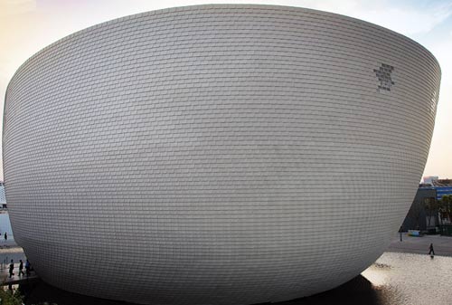 (点评:这种材料对太阳辐射具有很高的反射力,就像建筑外墙之外的第二层皮肤,为展馆遮阳。同时,网状透气性的织布结构能防止展馆内热气的聚积,可减轻展馆内空调设备的负担。)
