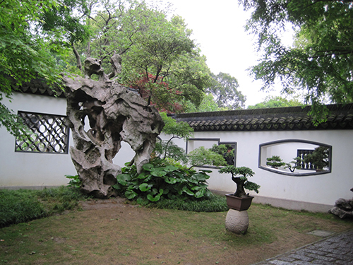 在园林的某一景区或景观中,作为物质生态建构序列中的“物”,也往往可以作为意凝神聚的元主题或主题,从而渲染一种意境。留园冠云峰庭院里,就有这种意凝神聚的整体组合。在冠云峰这一江南名石之前,有浣沼,为半规整形水池,池前为品赏冠云峰的最佳方位,池中又可照见这一瘦秀之峰的亭亭倩影,池水把她浣洗得更加清秀美丽。沼西为冠云台,供人在西南方位品赏这一名峰。沼东又有伫云庵,也以一个“云”字点题。峰后还有冠云楼,峰左右则陪衬着灿云、瑞云二峰。这一景观序列,对冠云峰从四面八方加以映衬、渲染、烘托,反复突出了一个“云”字,这是用聚焦的艺术方法取得整体意境效果的一例。