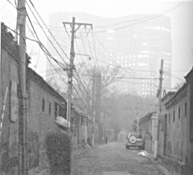 高楼笼罩着拥有七百多年历史的北京大乘胡同