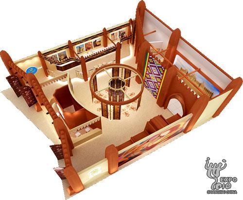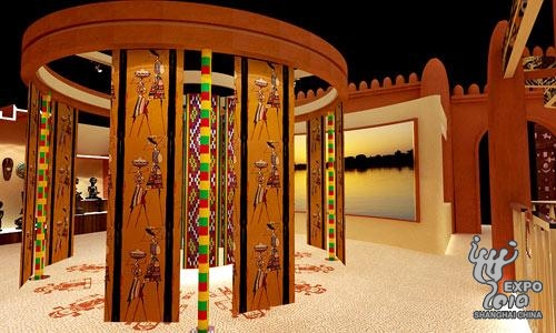 马里是西非文明古国,历史上曾是非洲第一个统一的黑人王国——马里帝国的中心。在马里中部尼日尔河内的三角洲最南端,有举世闻名的杰内大清真寺,坐落在被世人美誉为“尼日尔河谷的宝石”的杰内古城。此次马里馆最有特色的设计亮点就是运用了类似马里杰内大清真寺的建筑元素。马里馆注重文化和艺术感:旨在体现城市与乡村的结合。馆内大门上的独特图案为当地每家每户都会采用的金属凹凸键,图案各有不同,此次采用星星月亮,象征吉祥如意。同时,它的柱子融合当地苏丹诺-萨尔连式建筑,展现一个别具一格的马里馆。