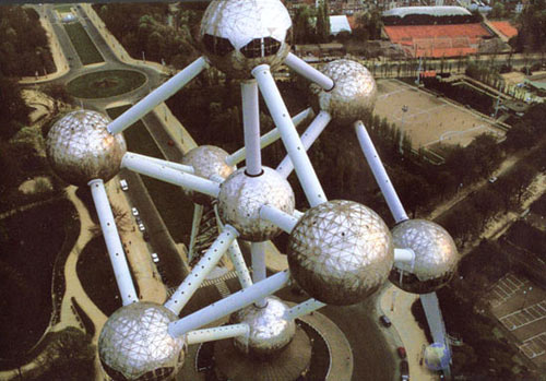 1955年组委会在征集世博会的标志性建筑物时,一致选中了工程师沃特金(A.Waterkein)设计的原子球建筑方案。原子球,它的建筑形状为9个巨大内空的金属球体组成,每个圆球代表一个原子,各球之间由26米长,直径3米的空心钢管连接。圆球与连接圆球的钢管构成一个正方体。这正是放大1650亿倍的a铁的正方体结构。9个圆球加上钢架结构总重量为2200吨,最高球顶达102米。球面采用了5800块三角弧形铝合金焊接而成。