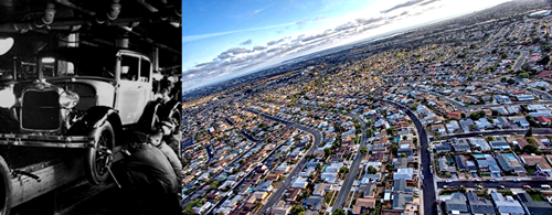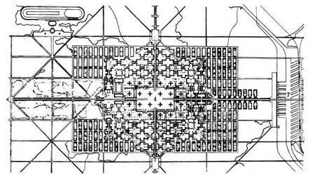 到了第二次工业革命,最主要有两个标志,一是汽车的出现,二是电报的出现(图3)。人们之间的信息传达效率提高很多,过去只能靠驿站和马,而此时人和人的距离超越了物理空间,汽车把人的腿拉长,电话把人的耳朵拉远。于是人们推出了关于城市的新的解决方案,有一部分能实现,有一部分不能实现。无论在北京还是其他的城市,仍然能看到以功能城市为主的解决方案(图4)。