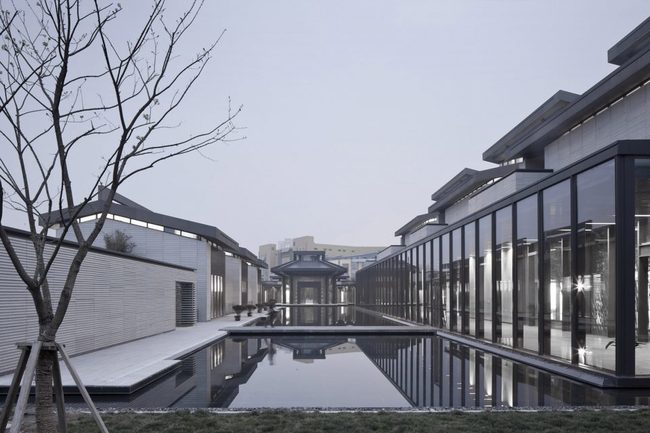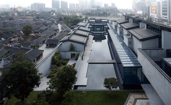 我有一个作品是泰州民俗文化村,现在叫中国(泰州)科学发展观展示中心。这个建筑处于老区和新城的交界的地方,一边和民居建筑群连在一起,另外一边则是新城,正好体现了传承与发展的概念。我们非常注意传统建筑的延伸,挨着传统建筑那边的高度,肌理、体量和形态都与传统相呼应,但是材料不同。我们吸收当地民居清水墙上图案的特点,改用石头做。由于新城尺度很大,在建筑和新城交界的地方,我就改成两层半;跟老交界的地方,我们减一层,并且利用之间的高低差做了个带状的水面,把江南水乡,一河两岸的特点融入了进去。这个建筑比较低调,有当地民居的特点、情调,但是用的材料是全新的,以前木头的、瓦的现在改用石头了,原来的青砖我也改用了石头和混凝土,但是其中吸收了很多原来表现形态的做法,一看就有当地的特色。这个做法贝聿铭先生做得非常成功,是我经常学习的对象。比如苏州博物馆,他非常注意建筑的高度、体量与传统民居的呼应,但是用的是新的材料,中为西用。我始终觉得一个重要建筑物,一看就是和传统融合在一起的,是呼应的,但绝对不是简单重复原来的做法,而是把它进行发展与延伸。