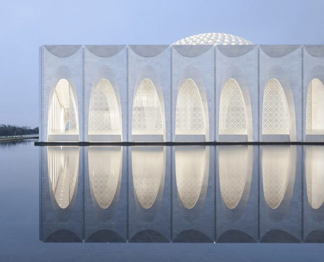 画完施工图后,我有一个学生驻到现场,专门研究拱怎么做,是用石头做呢,还是金属材料做?还是用GRC模仿石材的效果?为此我们做了很多一比一的样品,逐一比较。根据研究,伊斯兰文化里很多建筑都是纯白的,于是我们的五十六个拱选择用白色的大理石来做,表示它的宁静以及思想的简练。对于石头的纹理我们也做了很多的研究,有段时间我们专门驻在现场处理这个问题。我们的作品,光是画完图交给大家是不行的,一定要去到现场,不停地比较,才能做出精品。这个建筑的拱重复出一种韵律,前面有一个水池再加上池中间的倒影更能够凸显宁静、纯洁的氛围。考虑到水量问题,经过协调,我保留了入口的水,四十米宽,两边收窄一点,12米,最后效果非常好,非常漂亮。关于水池到底加不加栏杆,又要另外去讨论。我说这个水池不是真正的水池,很浅,只有20多公分的水,平常小孩都可以去玩,问题不大。最后我们决定不做栏杆,就有一个九米的跨,在跨的地方做一个灯座,形式完全按照拱的符号,晚上有一点灯光照在水边,效果非常好。