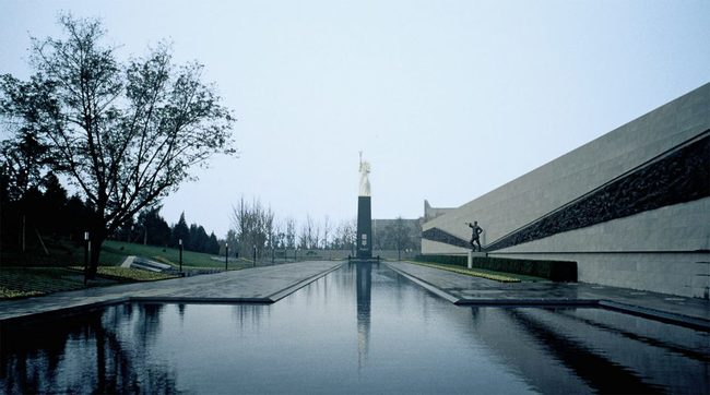 第二个我比较喜欢的作品是侵华日军南京大屠杀遇难同胞纪念馆扩建工程。老馆是齐康先生于一九八五年九月做的一个万人坑,非常成功。后来中央决定把老馆扩大到700米长,100米宽。我们设计时把纪念馆的主题设定为从战争到和平:这是希望人们可以在参观后感到震撼,永远记住这个历史事件,最终把人类带向共同的文明道路。纪念馆的设计采用了一系列空间的序列:从战争到屠杀,抗争到反思,再到和平。人在建筑中可以体验感受这一空间序列。侵华日军南京大屠杀遇难同胞纪念馆扩建工程和中国馆也象征了国家从悲惨走向富强的过程,我特别喜欢。