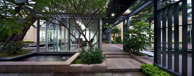 第三个作品不是很大,就是我的工作室。场地内原有上世纪三十年代老中山大学(华南理工大学五山校区位于国立中山大学原校址)有六套给教授住的小别墅,100多平方米一栋,坡屋顶,砖墙承重。因为漏水,建筑中的木头都腐烂了,但是由于它们有历史价值,所以被保留了下来。南边还有四栋房子是文化大革命刚刚结束的时候盖的,标准很低,装修很简陋。我经历四个阶段,前后用了十一年的时间分四期把这些老房子逐渐改造成为了现在的工作室。项目最大的特点是保持了建筑的历史原貌,外形不变,外墙材料肌理和屋顶形式不变,但是里面的功能完全改了。我们在建筑之间新增加了一些构件元素,既增加了一些使用面积又激活了空间,把零碎的空间串成了一个整体。小小的工作室内有数个庭院,高低错落,有水池,有廊,还有很多绿化;另外还加了丰富的现代构成元素,是一个现代的岭南建筑园林。工作室尺度非常好,用地4000多平方米,建筑总面积也是4000多平方米,建筑群落高低错落,空间非常有层次感,也解决了所有的功能。功能包括工作、讨论方案、展览、交流、存放图书资料等,此外还有一个小饭堂。我和我的同事以及学生一起在这里工作,这个工作室既是一个创作平台,又是一个科研基地,我们在这里做了许多现代建筑创作研究课题;同时工作室还是一个产学研基地,培养了一大批博士和硕士。最近中国建筑学会在这里挂了一个牌,我们又变成了一个全国建筑科普基地,可以供大家参观和交流。这个工作室体现了我的人生里非常重要的工作特性,就是走产学研相结合的创作道路。去年威尼斯建筑大学的老校长Marino教授到工作室参观后很感动,后来邀请我们去威尼斯建筑大学展出我们的设计作品和理念。经过我的学生和团队大半年的努力,展览在意大利威尼斯成功举办,主题是“地域性,文化性,时代性,为激变的中国而设计”。