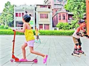新河浦,孩子们在老洋楼前嬉戏(图片来源:广州日报)