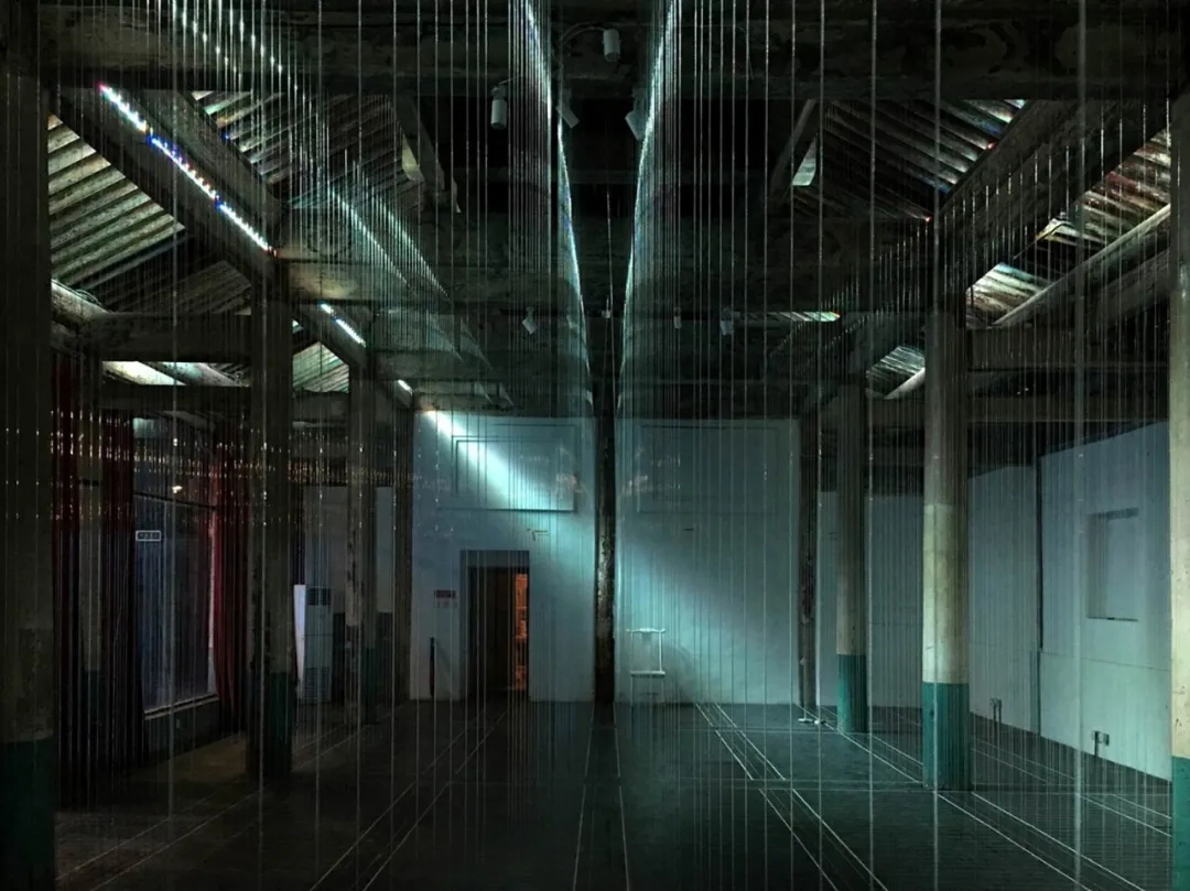 宏恩观原来是一座七檩硬山前后廊结构形式的传统寺庙建筑,是倒座房,因为是清朝的遗作,所以木构结构仍然非常清晰。但抬梁式结构屋架逐渐升高以后,人字形屋架里边的内部空间是比较昏暗的。最终,有一次我在这个空间里面一抬头,虽然光线昏暗,但我看到了这个建筑呈现出了一个非常完美的、严谨的木构建筑的一种结构逻辑。我突然意识到,可以用建筑的语言去表达一个传统建筑的审美价值所在,让进到这个房间的人能够真正理解什么是中国传统建筑,怎么去看待传统建筑。所以我就用类似于古建测绘的方法,在每一个建筑的构件之间用透明的弹力线,从上面垂下来到地面上,地面用黑色的胶合板,在地面上画了一张原大的足尺的建筑仰视图,这些线就存在空间中,和地下的交叉点连接起来。
