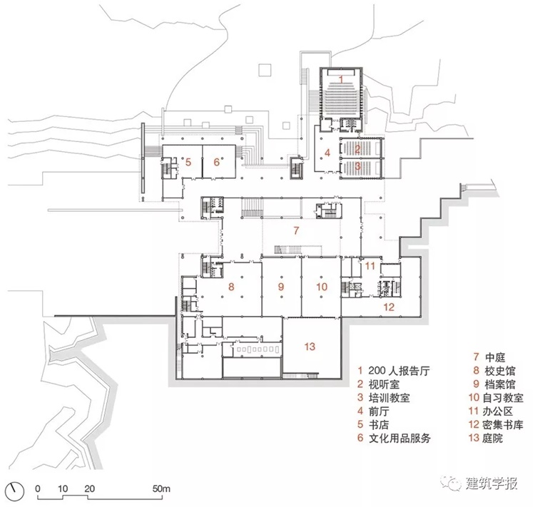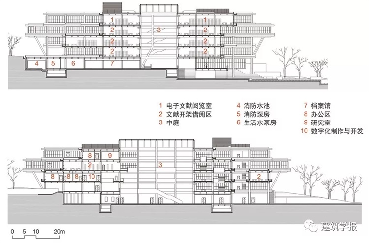 此外,我们去国外也看到了当代图书馆功能的转变。现在的图书馆也常常被称为“学习中心”,不是封闭的,而是开放性的校园空间。大家来了并非只是看书,还可以举办各种学术活动和展览。我希望这座图书馆也有一定的开放性,于是结合场地特点把建筑架起来,把报告厅、咖啡厅和小书店放在底层(图6~8)。这样从报告厅出来,就能走到水边上欣赏景观,形成交流的场所。我们把书库和设备机房嵌在右侧的山坡里,变成半覆土的建筑,比较自然地利用了地形。建筑一层基本上是校园的共享开放空间,二层以上才是图书馆真正的管理范围,设置了门厅、存包处和中央服务台,然后是图书馆的阅览区。把想法聚焦在树的意象,解决了两方面的问题:一个是场地的关系,一个是图书馆作为学校的学习中心(图9、10)。