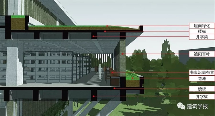 从树的意象出发,我们也考虑到绿色建筑设计(图11~13)。除了前面谈的底层开放空间外,在阅览室,考虑到学生喜欢靠近窗子看风景,就在窗口设置了花槽。二层以上有一些挑台,我们在挑台上也做了绿化花槽,并以挑台作为下层的遮阳构件。由于图书馆的正面是朝西的,西晒问题比较大。所以我们设置了一些格栅,让阳光不要直接照到阅览桌上。这些都是设计上的应对策略。今天看来尽管比较初步,还是落实了一部分绿色建筑和人文关怀理念。但是比较可惜的是,窗口和挑台屋顶绿化都没有做—甲方从一开始就很珍惜这个建筑,觉得浇花就把建筑弄脏了,养护成本又高,所以一直不肯做。我每次都跟他们讲,我对这个建筑的美学要求,是绿色建筑的自然美景,把绿化呈现出来,也是建筑表达的一部分。当然由于悬挑平台多,造成建筑体型系数大,不利于节能。徐州冬天气温低,悬挑会让楼板底面比较冷,脚底下不舒服。所以我们设计了地板采暖和窗口的风机盘管,希望冬天学生在窗户边上也很舒适。后来我们观察,冬天窗户边上的使用人数确实比较少,学生大多聚集在中部,这说明温度可能还是有些差别,没有真正解决这个问题。