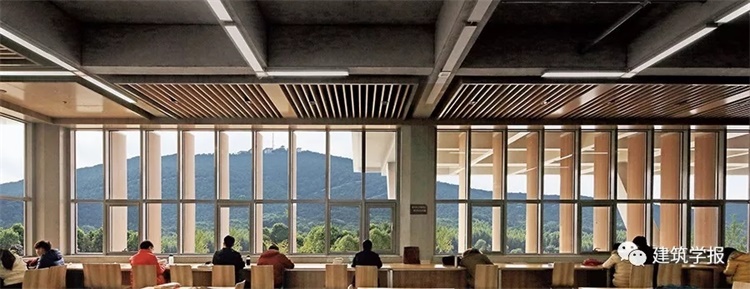 | 范 路 | 您刚才提到路易·康。其实在江苏职技图书馆项目中,我能感受到许多路易·康式精心的细部处理。当然,这是局部与整体逻辑一致的话题,也是理性主义的重要体现。比如在外立面上,对于出挑楼板端面的二次划分是等比例的,如同哥特束柱的处理方式,让楼板看上去更轻盈。而阅览空间采用玻璃加遮阳的设计,是在弱化建筑的体量感,强调楼板的水平性。再看室内,中庭的栏杆扶手处理成整条木板的形式,且后退以突显混凝土结构。而照明灯带安置在结构梁底面,是对井字梁形式的重复(图21)。实际上,这些处理都是在突出建筑的结构骨骼,强化设计草图中建筑如树木的意向。
