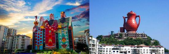 除了“官式山寨”外,还有一批被公认为丑陋的“象形建筑”,福禄寿酒店、巨型螃蟹、巨型甲鱼、巨型地球、巨型酒瓶、巨型莲花。