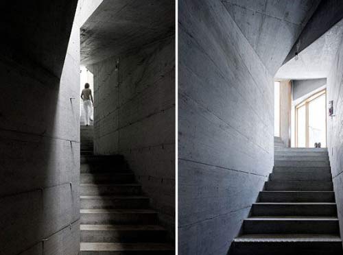 地下住宅位于瑞士Vals村的深山中,不仔细看的话你很可能错过它。混凝土结构塑造成一个宽阔的椭圆形入口,通过一系列嵌在斜坡上的石头台阶,人可以到达地下。在楼梯顶端的中央庭院,被由大窗户组成的大跨度立面所环绕着,将对面峡谷中阿尔卑斯山美妙的景色引入室内。