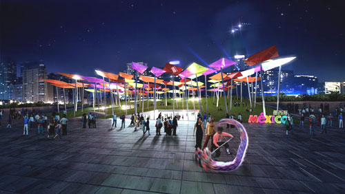 “你看,被绿草覆盖的斜坡和插在上面的100多个色彩斑斓的巨大风筝,构成强大的视觉冲击力,吸引游人驻足欣赏。”拉米雷斯指着墨西哥馆效果图说。游客在这片草地上看书、聊天、休息,或是观看不远处广场上举行的各种文艺活动,不禁让人联想到周末的集市、街心的花园、社区的一隅……