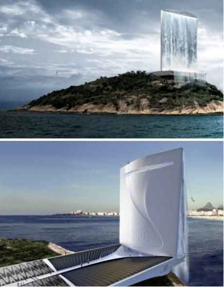 4、巴西巨型发电塔。RAFAA建筑设计事务所为2016年巴西里约热内卢奥运会设计的“太阳能城市塔”可在白天利用太阳能发电,日落后再利用抽蓄水系统发电。它的最大亮点当属一个又大又高的瀑布,好像来自天空,给人一种超现实的感觉。发电塔将为奥运会提供大量电量,象征大自然力量的瀑布倾泻而下场面只在特定场合时出现。