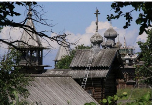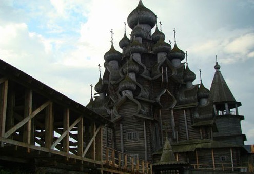 据记载,早在1616年就有过对这三座建筑的描绘,但17世纪末它们遭雷击烧毁,后来相继在原址重建。其中,主变容教堂首先确立了主导地位,并决定了后来建筑的特点。尽管建造年代不同,结构有别,但就连对建筑艺术外行的人也会深信不疑:它们构成了一个统一的整体。从教堂建筑中,你可以聆听到多神教(当地原居民的宗教)的余音,感觉到东正教的喜庆气氛、巴洛克富丽堂皇的痕迹,以及卡累利阿和维普斯人的文化气息。而匀秀、挺拔的钟楼则显示出19世纪下半叶城市石头建筑的影响,尽管它采用了某些非民间木结构建筑的工艺,但仍保持了建筑群的平衡与完整。所有建筑的墙体均用圆木垒造,古朴中透出均衡的节奏感。而错落有致的教堂圆顶,用刚削好的山杨木犁形板呈梯状覆盖并镏金,天长日久变成了今天这种高贵稀有的银白色,尤其在阳光的照射下,数十个圆顶闪烁出迷人的光泽。