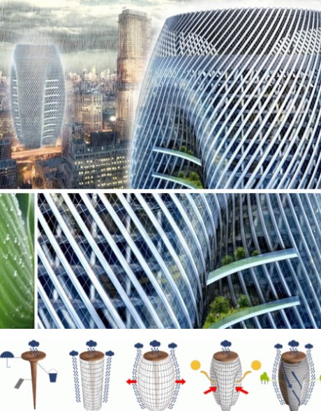 如何让建筑在最大程度上收集雨水?H3AR设计的集雨摩天楼可能给出答案。借助于覆盖整个外部的水槽网,雨水将直接流入一个处理厂。处理后获得的生活用水可用于冲马桶、洗衣服、其他清洗工作以及浇灌植物。根据H3AR的设计,摩天楼的皮肤与屋顶上一个巨大的碗状雨水收集设施结合在一起,在最大程度上获取雨水。