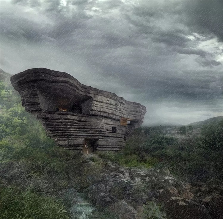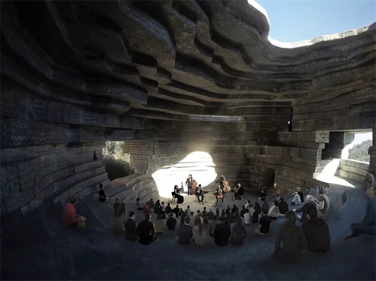 Michael Webb:你用粗糙的混凝土材料创造了一个像天然岩石的建筑结构,并创造了一个人造洞穴可供进行表演。而且我设想有自然的声音进入,如鸟儿或风的声音。所以它是人造和自然的融合。这个项目比沙丘美术馆还要更进一步,在这个除了一个小村庄没有任何人类痕迹的纯粹的野外场地,更加与自然融为一体。