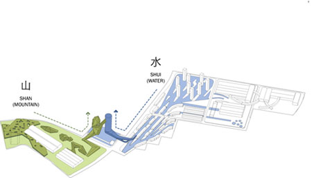 斯蒂文.霍尔的设计方案,击败了建筑师赫尔佐格—.德梅隆(Herzog and de Meuron)的方案和大卫.奇普菲尔德(David Chipperfield)的方案。斯蒂文.霍尔的设计方案将场地划分为“水区”和“山区”两个主题。