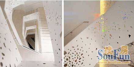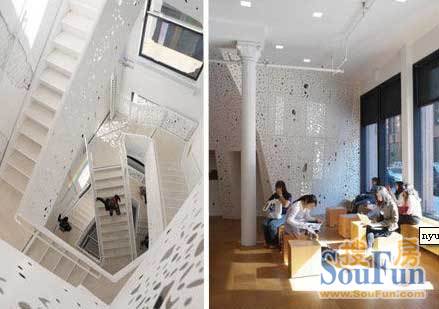 只看纽约大学哲学系的这栋教学楼不起眼的外观,你永远不会猜到内部有多么的优雅。建筑设计师史蒂芬-霍尔(Steven Holl)负责这栋大楼的内部装修设计。优雅而简约的白色墙壁象征着看上去简单却又摸不透的哲学,楼梯回栏几何造型神秘而别致,还有镂空雕花的装饰,增添优雅感。更妙的是,随着时间和季节的不同,穿过镂空花饰的光线会在墙壁和楼梯上留下不同的花样效果。