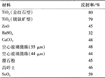 功能填料是反射红外辐射最重要的材料之一。根据材料对光吸收理论的能带理论,功能填料应该选择电导率高、禁带宽度不在0.5~3.1eV范围内的物质。一般说来,白色物质不仅对可见光有较强的反射性,对近红外辐射也有较强的反射性。根据表1可以发现TiO2、ZnO、BaSO4、SnO2等均符合禁带宽度和白色的要求,它们的近红外反射率如表2所示。